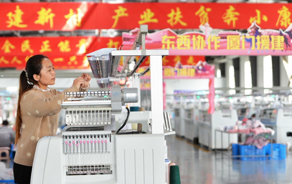在甘肅省臨夏回族自治州永靖縣劉家峽鎮(zhèn)一個廈門援建的扶貧車間里,工人在針織生產(chǎn)線上作業(yè)(2020年10月31日攝)。