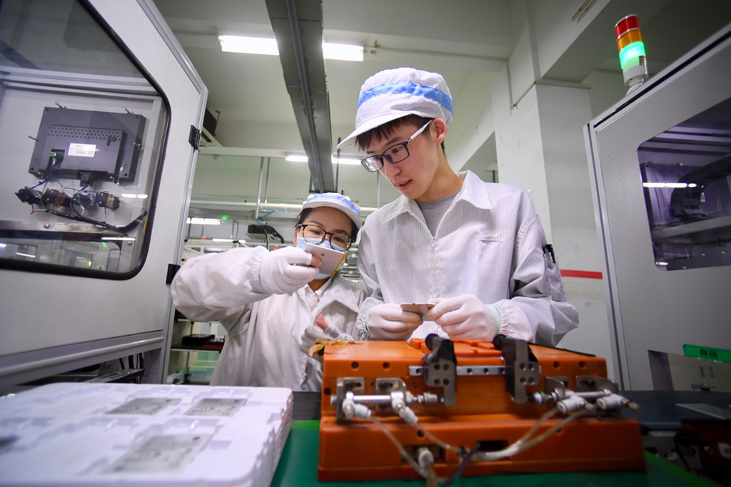 福建省飛毛腿高級技工學(xué)校三年級寧夏籍學(xué)生海鵬(右)在飛毛腿(福建)電子有限公司車間實(shí)習(xí)(2021年3月4日攝)。