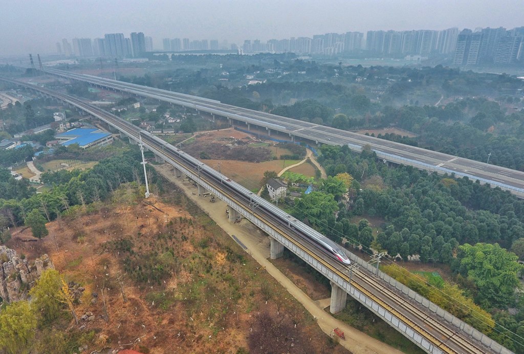 G8607次“復(fù)興號”高鐵列車從成都東站出發(fā)開往重慶沙坪壩(2020年12月24日攝)。