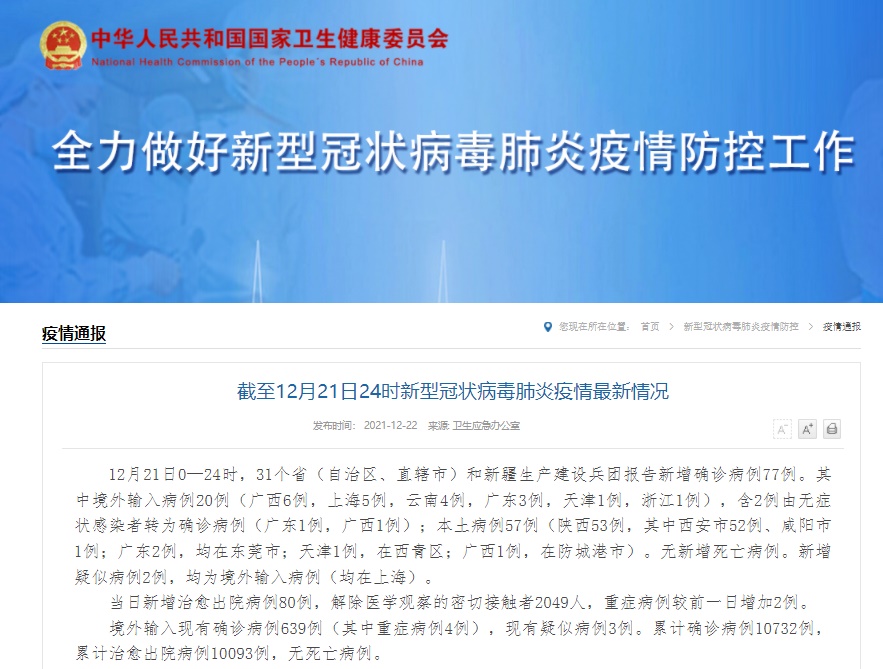 12月21日0—24時(shí),31個(gè)省(自治區(qū)、直轄市)和新疆生產(chǎn)建設(shè)兵團(tuán)報(bào)告新增確診病例77例。其中境外輸入病例20例(廣西6例,上海5例,云南4例,廣東3例,天津1例,浙江1例),含2例由無(wú)癥狀感染者轉(zhuǎn)為確診病例(廣東1例,廣西1例);本土病例57例(陜西53例,其中西安市52例、咸陽(yáng)市1例;廣東2例,均在東莞市;天津1例,在西青區(qū);廣西1例,在防城港市)。無(wú)新增死亡病例。新增疑似病例2例,均為境外輸入病例(均在上海)。