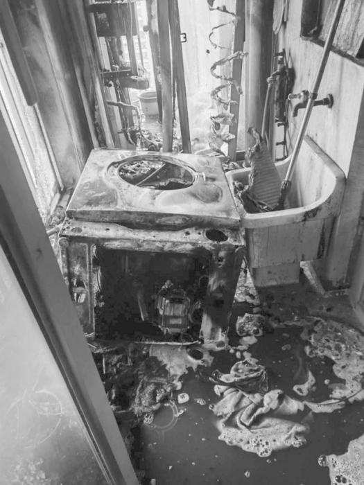 經了解,起火點位于業(yè)主家的北陽臺,業(yè)主將吹風機開機對著陽臺水管吹了整整一夜,該吹風機發(fā)生故障著火后引燃了堆積的雜物,洗衣機被燒得只剩下骨架,玻璃窗戶受熱后完全破碎,雜物悉數(shù)被燒,水管、墻面也被熏黑。