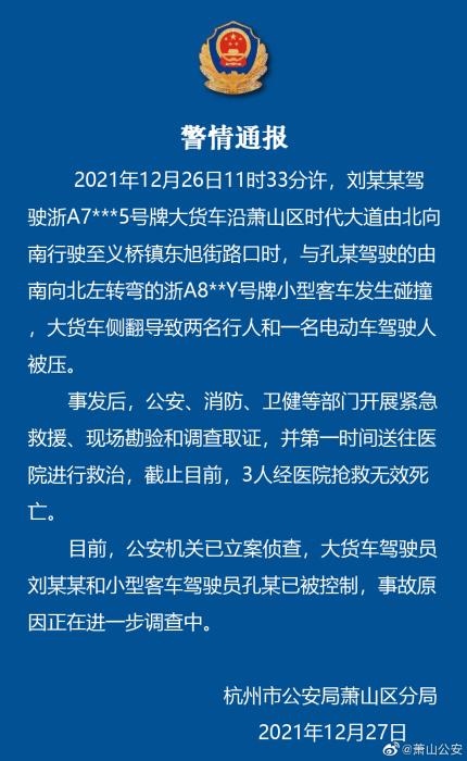 中新網(wǎng)12月27日電 杭州市公安局蕭山區(qū)分局27日通報(bào),12月26日11時(shí)33分許,一大貨車與一小型客車在蕭山區(qū)一路口發(fā)生碰撞,大貨車側(cè)翻導(dǎo)致兩名行人和一名電動車駕駛?cè)吮粔?。截至目前?人經(jīng)醫(yī)院搶救無效死亡。