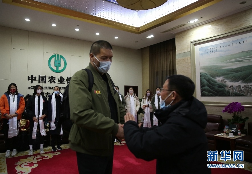 內蒙古籃球協會主席巴特爾與前來迎接球隊的球迷握手。新華網楊騰格爾攝
