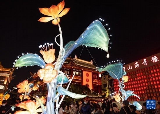 2月15日,市民和游客在上海豫園九曲橋賞燈。