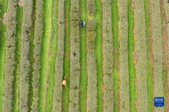 2月17日,茶農(nóng)在湖北省丹江口市土關埡村武當茶谷勞作(無人機照片)。
