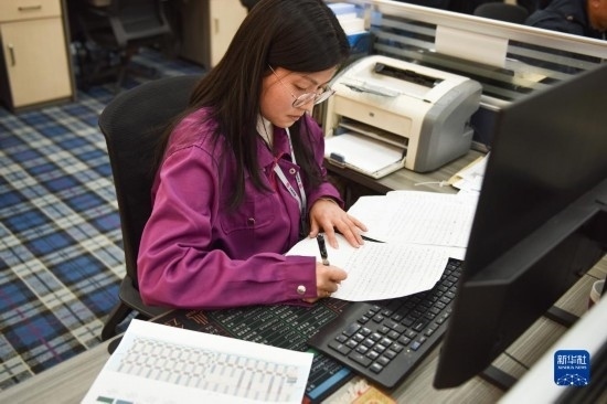 2月21日,在西寧市圣源地毯集團有限公司設計銷售車間,一名藏毯設計師在繪制圖案。