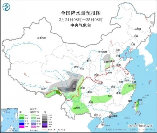 全國降水量預報圖(2月23日08時-24日08時)。圖片來源:中央氣象臺網(wǎng)站