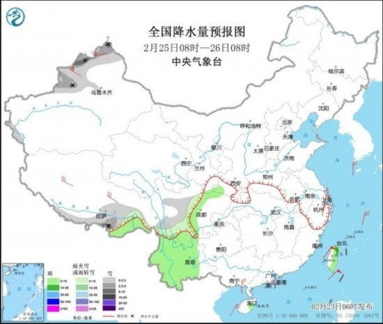 2月25日08時至26日08時,新疆西北部、西藏南部、川西高原等地的部分地區(qū)有小到中雪或雨夾雪,其中新疆北部山區(qū)及伊犁河谷等地局地大雪(5~9毫米);四川西南部、云南中西部、西藏東南部、臺灣島等地的部分地區(qū)有小到中雨。新疆西北部、西藏中部、浙江、廣西南部等地的部分地區(qū)有4~6級風。臺灣海峽有8~9級、陣風10級的東北風,東海南部、南海有7~8級、陣風9級的東北風。