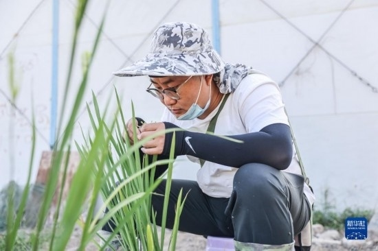 2月22日,青島海水稻研究發(fā)展中心的科研人員在海南三亞的國家南繁科研育種基地里做水稻雜交實驗。