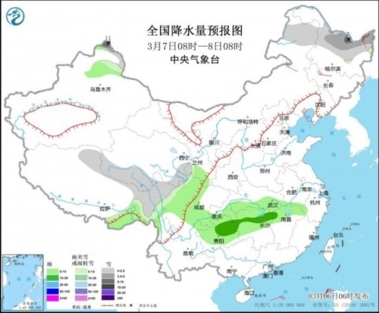 3月7日08時(shí)至8日08時(shí),新疆北疆北部、西藏北部和東部、青海南部、川西高原北部、內(nèi)蒙古東北部、黑龍江北部等地部分地區(qū)有小到中雪或雨夾雪,其中,黑龍江北部等地部分地區(qū)有大雪,新疆北疆北部局地有暴雪(10~11毫米);新疆沿天山地區(qū)、西藏東南部、甘肅南部、四川中部、重慶、貴州大部、湖南北部、江西北部、湖北南部等地部分地區(qū)有小到中雨。內(nèi)蒙古中東部、黑龍江東北部、吉林中部、遼寧大部等地部分地區(qū)有4~6級(jí)風(fēng)(見圖2)。