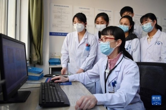 3月6日,馬娜(前)在辦公室為前來(lái)實(shí)習(xí)的西北民族大學(xué)醫(yī)學(xué)院學(xué)生講解業(yè)務(wù)知識(shí)。