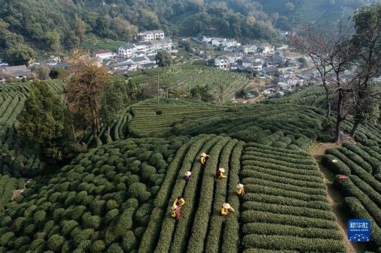 3月13日,梅家塢村的茶農(nóng)在采摘西湖龍井“明前茶”(無人機照片)。