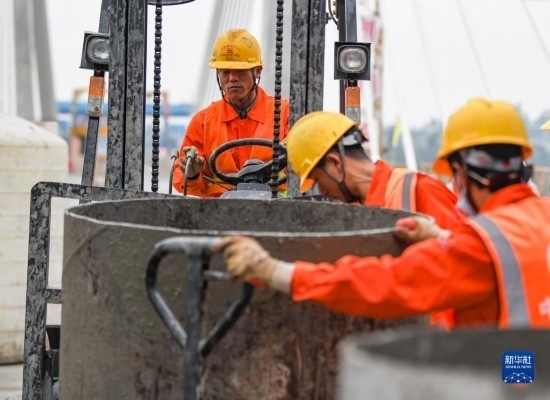 3月18日,在位于四川省瀘州市的渝昆高鐵瀘州沱江特大橋主跨合龍現(xiàn)場,施工人員在進行混凝土澆筑。