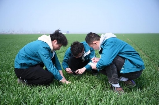 2月28日,在西平縣老王坡高標準農田示范區(qū),臺曉林(左)、王仲琦和王英凡(右)一起觀察苗情草情并記錄。