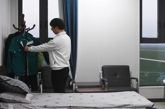 3月14日,在西平縣老王坡高標準服務中心的宿舍內,臺曉林下班后換下工作服、整理衣架。