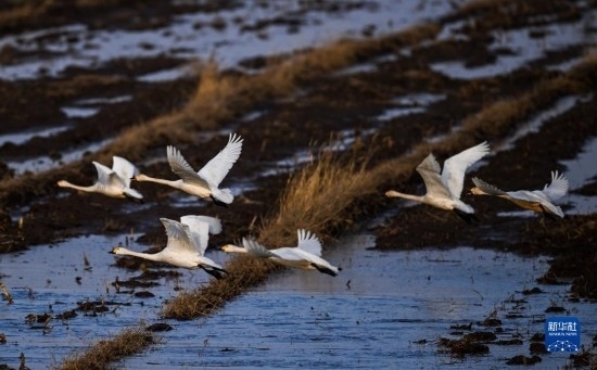 3月20日,在內(nèi)蒙古自治區(qū)呼和浩特市托克托縣黃河沿岸,天鵝在空中飛翔。
