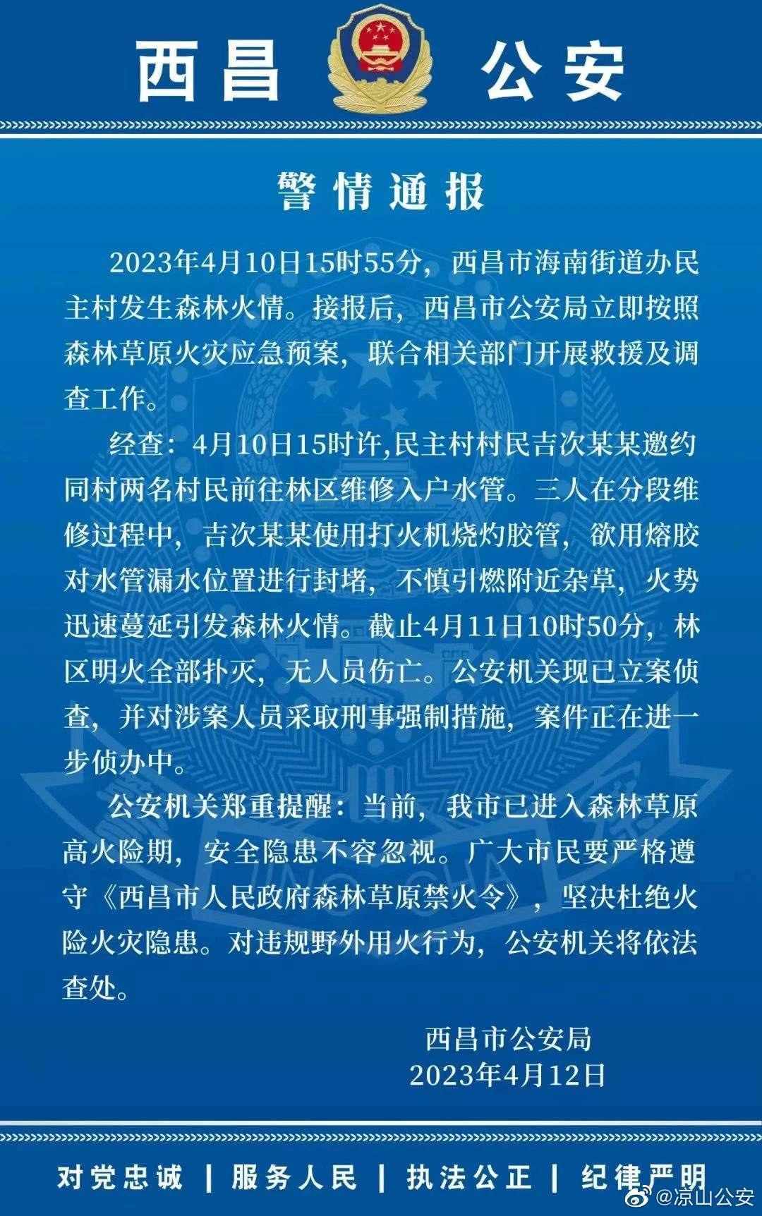 ·西昌警方通報森林火災調(diào)查:村民燒灼膠管修水管引燃雜草,涉案人員被控制。
