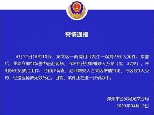 ·漳州公安通報萬達砍人案:男子因感情糾紛行兇致一人死亡,被當場抓獲。