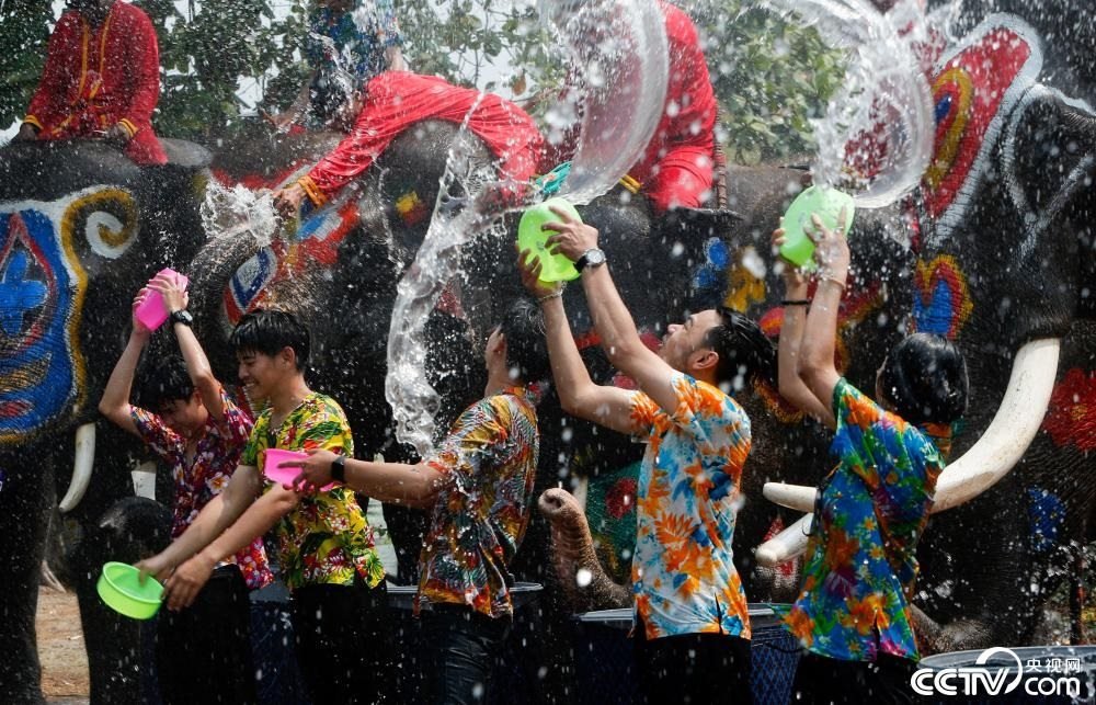 當?shù)貢r間2023年4月11日,泰國大城府,大象與游客相互潑水,歡度潑水節(jié)。