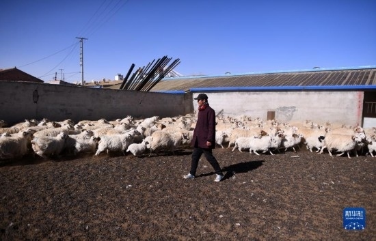 4月14日,在青海省海北藏族自治州剛察縣泉吉鄉(xiāng)寧夏村,牧民拉寶家的羊群離開羊圈前往草場。