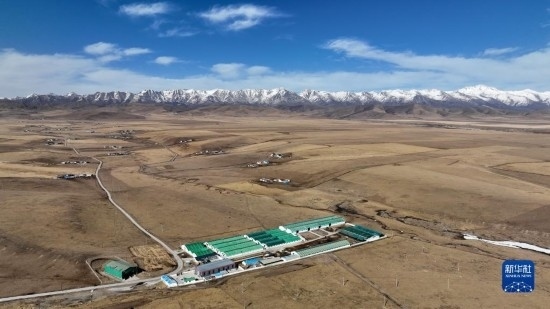 4月16日在青海省海北藏族自治州門源回族自治縣皇城蒙古族鄉(xiāng)拍攝的養(yǎng)殖畜棚(無人機照片)。