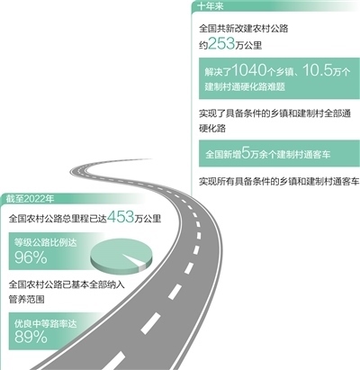 一條條“四好農(nóng)村路”修到村頭,通到了鄉(xiāng)親們的家門口。截至2022年,全國(guó)農(nóng)村公路總里程已達(dá)453萬(wàn)公里,等級(jí)公路比例達(dá)96%。十年來(lái),我國(guó)支持貧困地區(qū)新改建了6.5萬(wàn)公里資源路、旅游路、產(chǎn)業(yè)路。