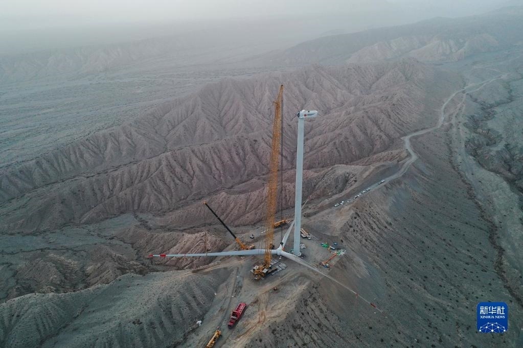 在新疆克孜勒蘇柯爾克孜自治州烏恰縣,風(fēng)機(jī)葉輪提升至相應(yīng)高度后與機(jī)艙對(duì)接(4月21日攝)。