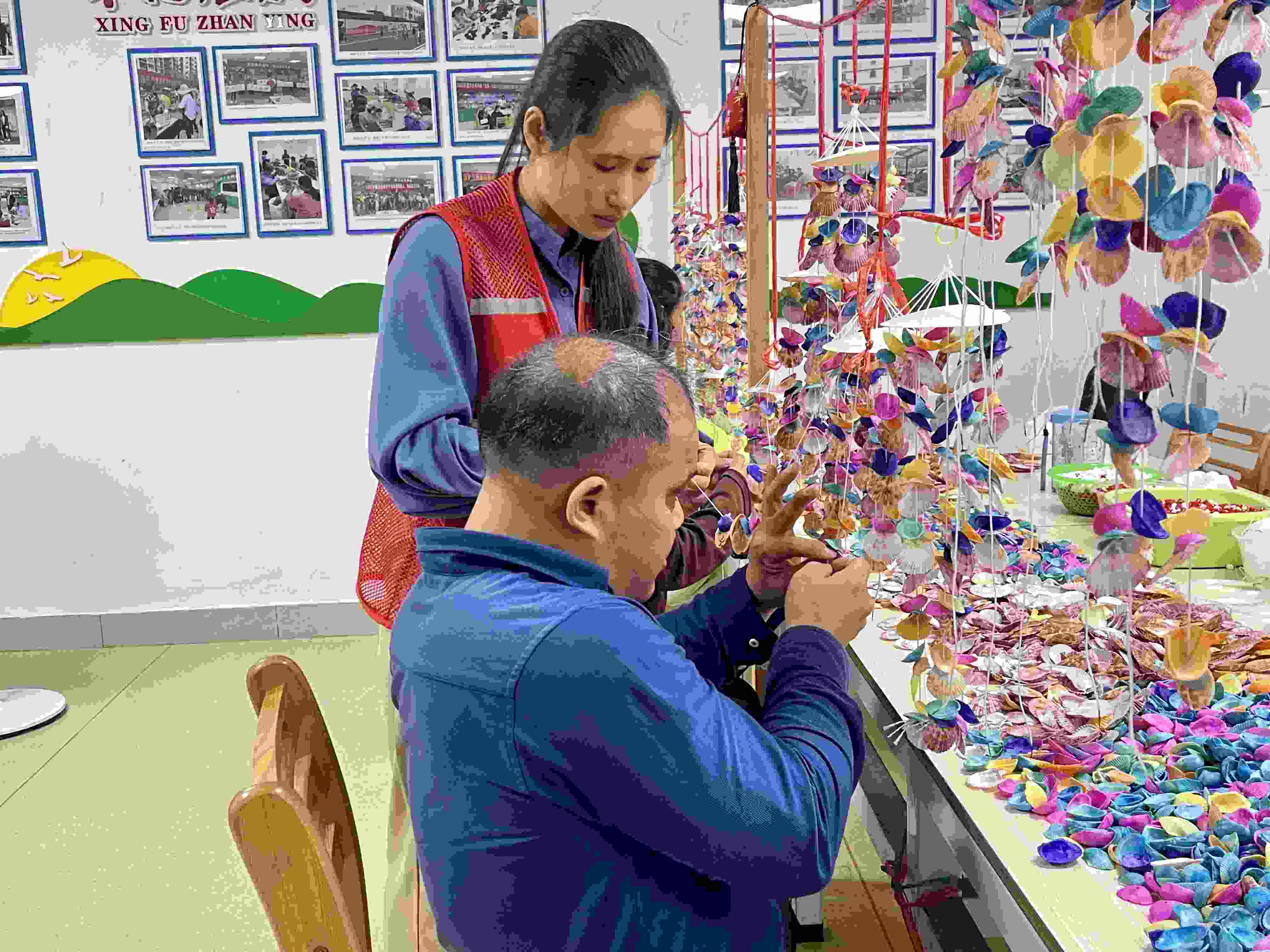 工作人員在教殘疾人張清氧串貝殼,雖然動(dòng)作還略顯遲鈍,但他一直在耐心學(xué)習(xí),“我每天騎三輪車上下班,在這里工作很開(kāi)心,可以自己賺到錢了。”