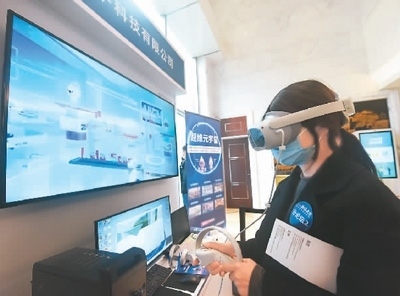 3月16日,在浙江省杭州市2023西溪大會·全球數(shù)字科技峰會上,虛擬現(xiàn)實產(chǎn)品設(shè)計師利用VR技術(shù)探索“超維元宇宙”。龍 巍攝(人民視覺)