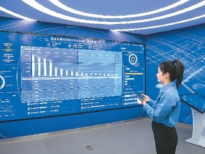 2月24日,在山東省東營經(jīng)濟技術(shù)開發(fā)區(qū)的東營工業(yè)互聯(lián)網(wǎng)創(chuàng)新中心,碳排放管理員通過碳達峰大數(shù)據(jù)平臺,查看和展示開發(fā)區(qū)企業(yè)實時耗能情況。周廣學(xué)攝(人民視覺)