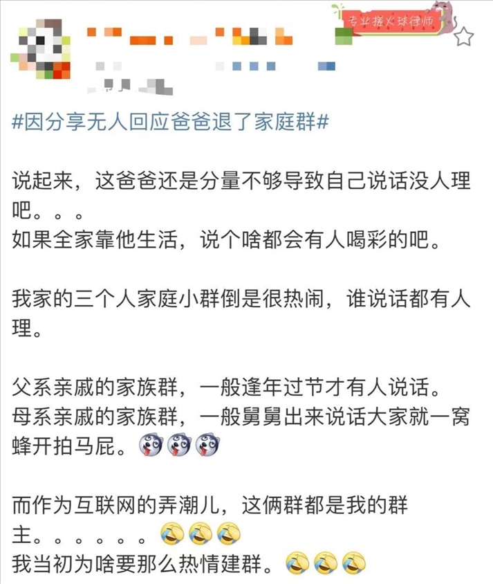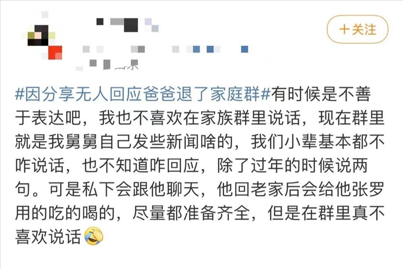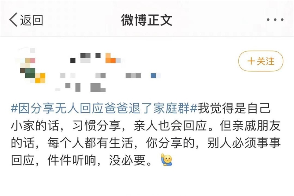 日前,一則“因分享無(wú)人回應(yīng)爸爸退了家庭群”的話(huà)題引發(fā)公眾關(guān)注,登上熱搜。