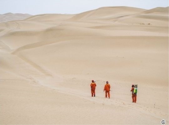 圖⑤東方地球物理公司新疆塔里木物探處的工人馮永生(前)、馮雙生(中)、馮志鵬在沙漠中進(jìn)行測量定位,標(biāo)記鉆井點。新華社發(fā)