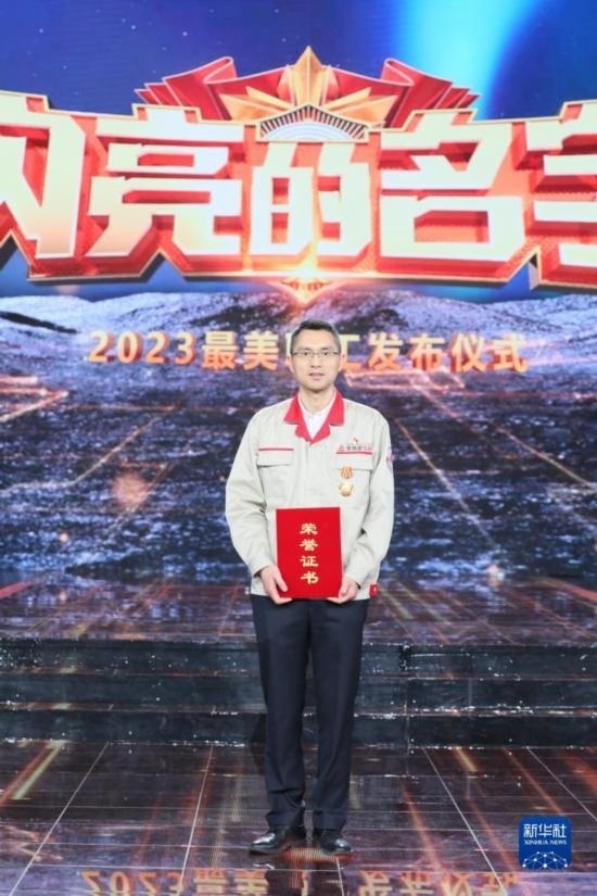 中核陜西鈾濃縮有限公司真空設備研發(fā)中心首席技師溫偉在“最美職工”發(fā)布儀式上(4月21日攝)。新華社發(fā)(王鑫 攝)