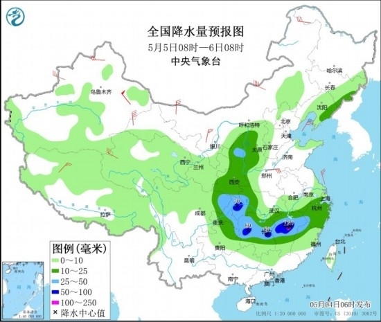 5月4日08時至5日08時,湖北南部和東部、安徽南部、湖南東北部、江西中北部、浙江西部、江蘇南部以及山東半島、遼寧南部、河北東部等地部分地區(qū)有大到暴雨,其中,安徽南部、江西北部等地部分地區(qū)有大暴雨(100~120毫米)。上述部分地區(qū)伴有短時強降水(最大小時降雨量20~40毫米,局地可超過50毫米),局地有雷暴大風等強對流天氣。內(nèi)蒙古中部、黑龍江東北部、新疆南疆盆地、甘肅河西、山東半島等地部分地區(qū)有4~6級風,其中,新疆東部部分地區(qū)有8~9級風。渤海、渤海海峽、黃海大部、東海北部海域?qū)⒂?~8級、陣風9~10級的大風。
