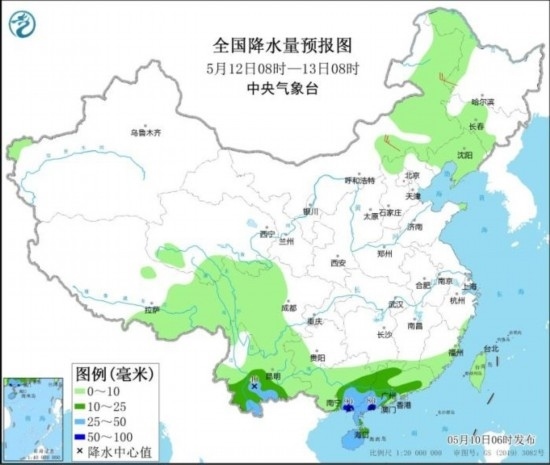 5月11日08時至12日08時,西藏北部和東部、青海南部等地部分地區(qū)有小到中雪或雨夾雪;西藏東南部、云南南部、江南南部、華南大部等地部分地區(qū)有中到大雨,其中,廣西東部和東南部沿海、廣東西南部、海南島東部等地部分地區(qū)有暴雨或大暴雨(100~120毫米)。內(nèi)蒙古大部、西北地區(qū)東北部、華北北部、遼寧等地部分地區(qū)有4~6級風。