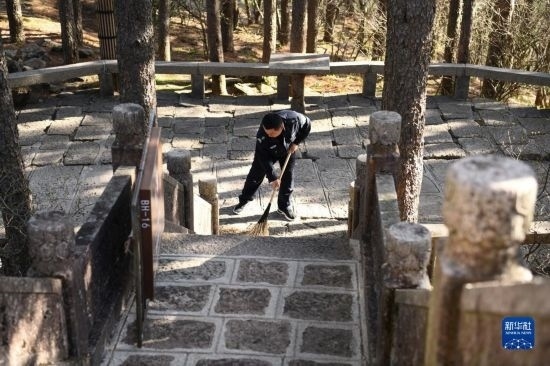 4月21日,在黃山風(fēng)景區(qū)平天矼瞭望哨門(mén)口,秦志平在打掃山道。