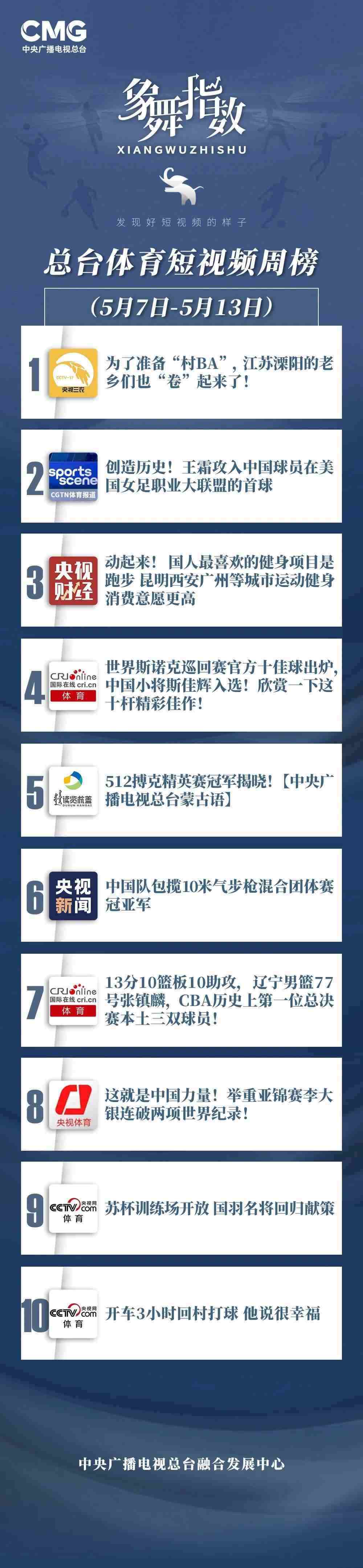 中央廣播電視總臺“象舞指數(shù)”評議品牌,推出體育短視頻周榜、總臺體育短視頻周榜。在5月7日—5月13日,以下內(nèi)容獲得矚目: