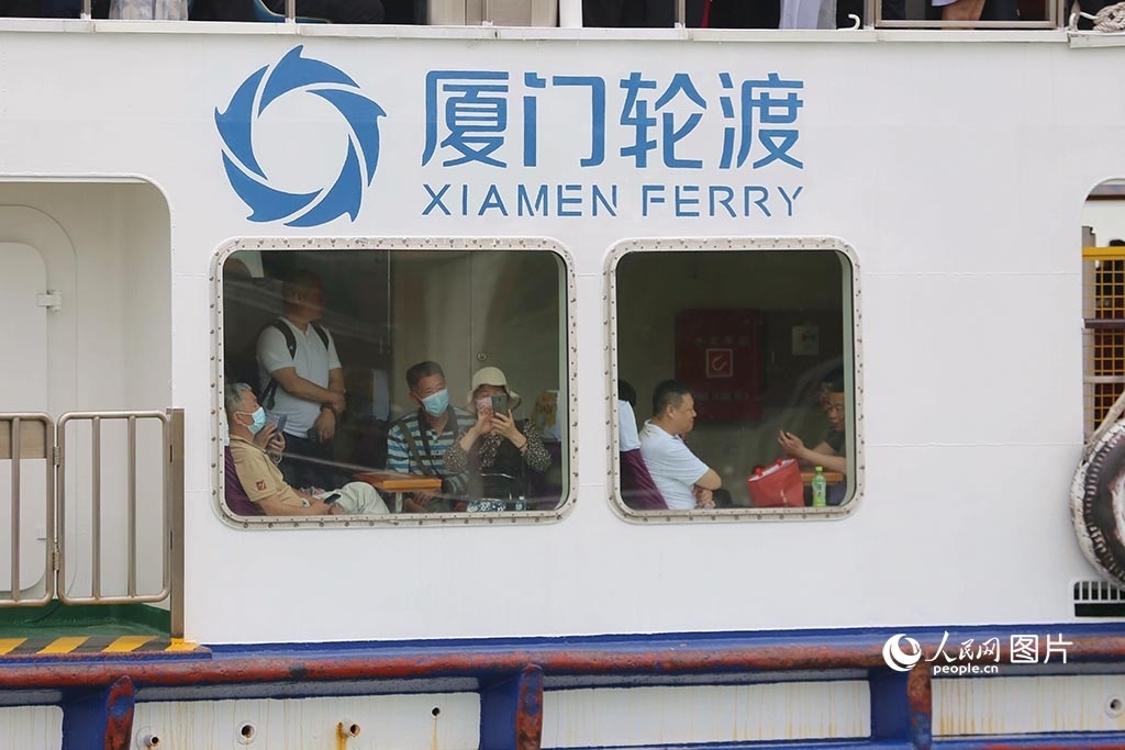 5月14日,廈門輪渡船??抗睦藥Z內(nèi)厝澳碼頭,船艙里的游客迫不及待地拿起手機(jī)拍照。人民網(wǎng)記者 陳博攝