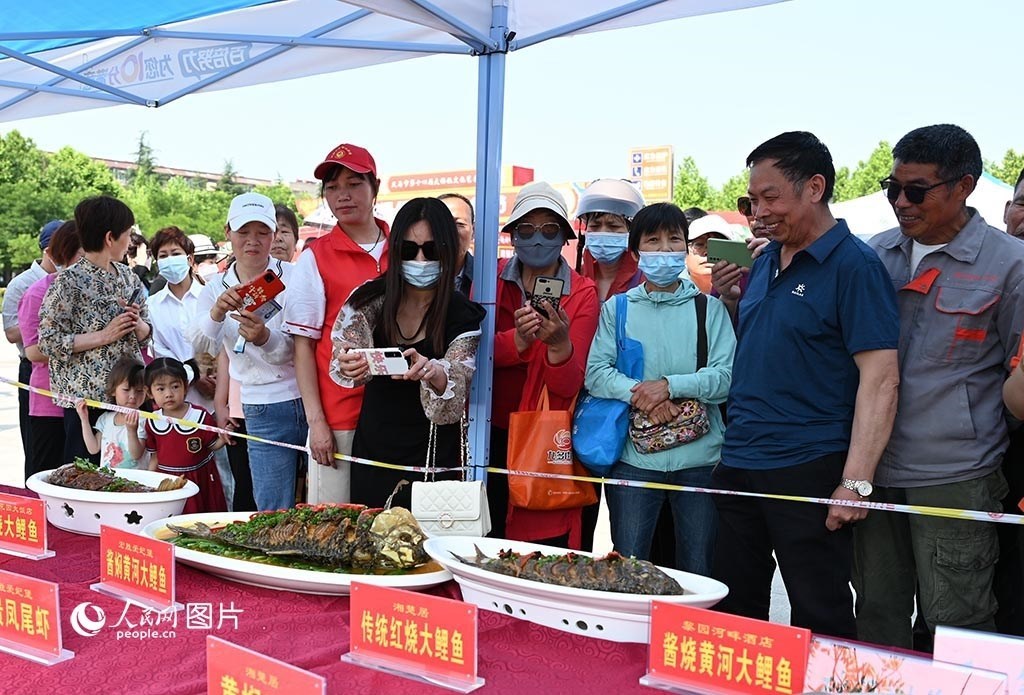 5月17日,“中國旅游日”主題周活動(dòng)期間,河南省義馬市舉辦“櫻紅五月”美食節(jié),集中展示當(dāng)?shù)氐奶厣朗?、名?yōu)特產(chǎn),為了讓游客有更好的體驗(yàn),當(dāng)?shù)?2家飯店還進(jìn)行了精彩紛呈的廚藝大比拼?;顒?dòng)現(xiàn)場(chǎng),游客在圍觀經(jīng)典豫菜“紅燒黃河大鯉魚”。人民網(wǎng)記者 王玉興攝