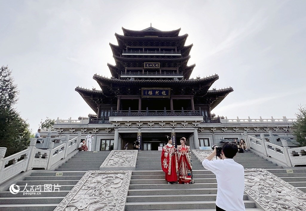 今年以來,濟(jì)南大明湖畔的“江北第一樓”超然樓因其獨(dú)特的人文氣息和景觀氣質(zhì)火爆網(wǎng)絡(luò),成為爆火“出圈”的網(wǎng)紅打卡地。5月16日,在大明湖超然樓前,身穿古代服飾打卡拍照的游客絡(luò)繹不絕,在山色與湖光之間盡展古韻美感。人民網(wǎng)記者 劉祺攝