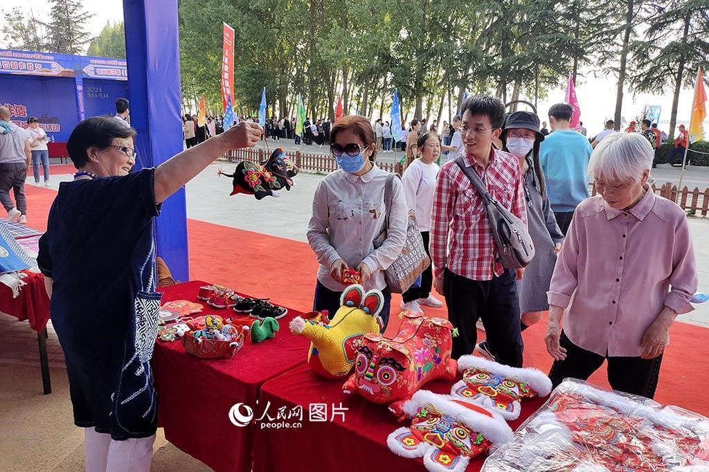 5月14日,“中國旅游日”主題周活動(dòng)期間,河南省三門峽市陜州區(qū)在黃河岸邊舉辦“傳承多彩非遺”魅力陜州非物質(zhì)文化遺產(chǎn)展演體驗(yàn)活動(dòng),大展傳統(tǒng)藝術(shù)魅力,為群眾獻(xiàn)上了一場(chǎng)“非遺文化盛宴”。在活動(dòng)現(xiàn)場(chǎng),當(dāng)?shù)厥〖?jí)非遺傳承人向游客展示文創(chuàng)產(chǎn)品布老虎。人民網(wǎng)記者 王玉興攝