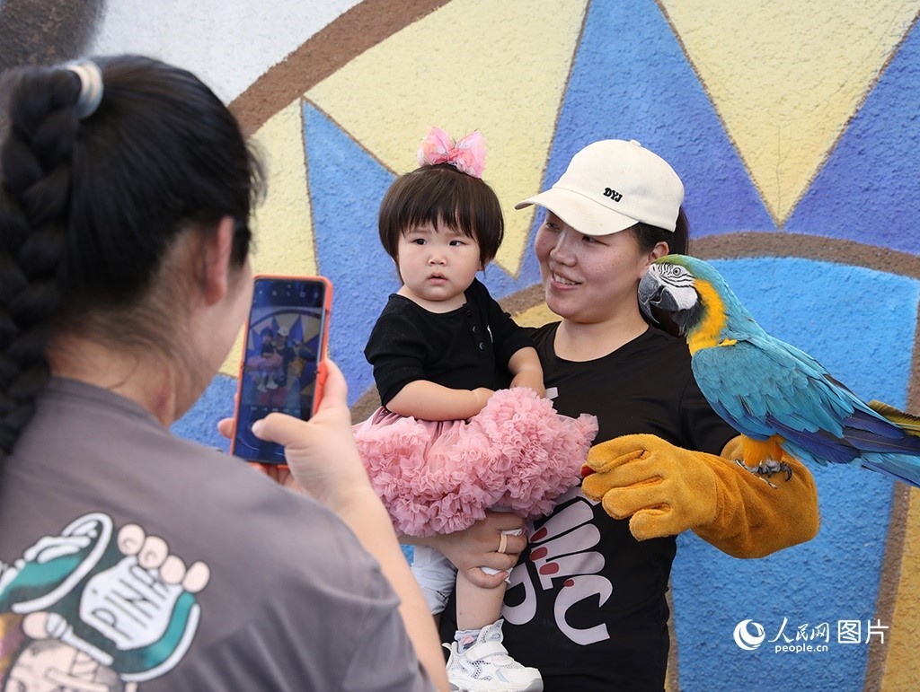 5月18日,雄安郊野公園辛瑪森林動(dòng)物樂園內(nèi),家長帶著孩子正與表演動(dòng)物互動(dòng)。人民網(wǎng) 李兆民攝