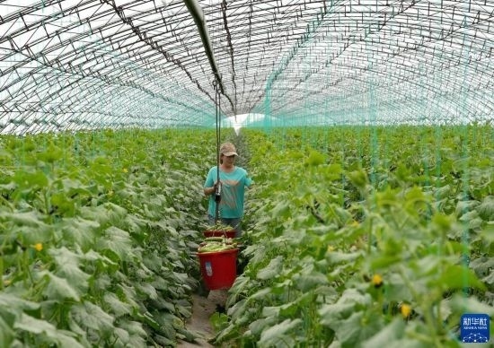 5月21日,河北省灤州市小馬莊鎮(zhèn)農(nóng)民在大棚內(nèi)采摘黃瓜。