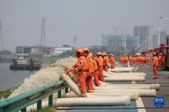 6月2日,在水域救援實戰(zhàn)演習(xí)現(xiàn)場,消防救援人員在湘江邊模擬內(nèi)澇排水。