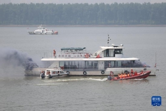 6月2日,在水域救援實戰(zhàn)演習(xí)現(xiàn)場,消防救援人員駕駛消防艇在模擬水上滅火行動(無人機照片)。