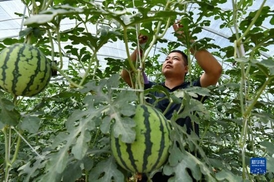 6月4日,農(nóng)民在獻(xiàn)縣河城街鎮(zhèn)梅莊洼農(nóng)場大棚內(nèi)管理種植的西瓜。