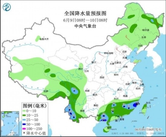 圖2 全國降水量預(yù)報(bào)圖(6月9日08時(shí)-10日08時(shí))