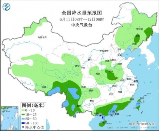 9日至11日,江南、華南、云南等地有中到大雨,局地有暴雨或大暴雨,小時(shí)雨量20~50毫米,局地可達(dá)60毫米以上;預(yù)計(jì)6月9日08時(shí)至10日08時(shí),廣西南部和東北部、湖南南部、江西南部、福建中南部、廣東西北部、云南西部、四川西部等地部分地區(qū)有大到暴雨,其中,福建東部沿海、廣西東南部沿海等地局地有大暴雨(100~180毫米)。上述部分地區(qū)伴有短時(shí)強(qiáng)降水,局地有雷暴大風(fēng)或冰雹等強(qiáng)對(duì)流天氣。中央氣象臺(tái)6月9日06時(shí)繼續(xù)發(fā)布暴雨藍(lán)色預(yù)警(見圖1)。