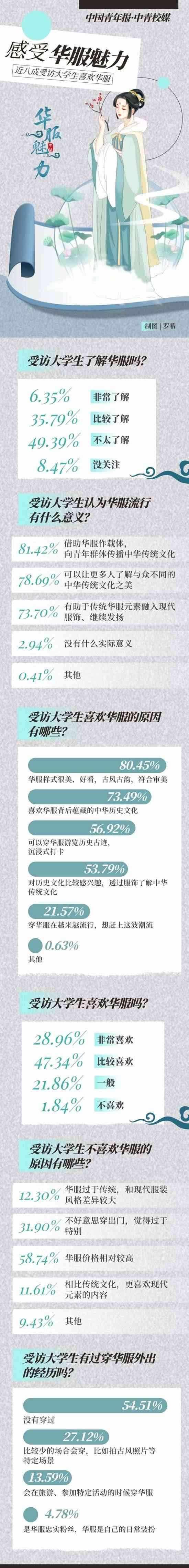 穿華服正在成為一些年輕人旅游或日常出行的選擇。“華服”,是指具有中華民族歷史文化基因、精神風(fēng)貌,且融合當(dāng)代審美的禮儀性服裝,其服裝風(fēng)格根植于中華傳統(tǒng)文化,傳承中華民族特質(zhì),體現(xiàn)當(dāng)代社會(huì)積極向上的時(shí)代精神,具有鮮明的辨識(shí)度,適用于國(guó)際交往、文化交流、商貿(mào)往來(lái)以及日常節(jié)慶、典祭等禮儀場(chǎng)合。自2018年起,每年的農(nóng)歷三月初三被選定為“中國(guó)華服日”,在前不久結(jié)束的第五屆“中國(guó)華服日”活動(dòng)中,上萬(wàn)名青年華服愛(ài)好者匯聚活動(dòng)現(xiàn)場(chǎng)參與體驗(yàn)。近日,中國(guó)青年報(bào)社·中青校媒面向全國(guó)高校大學(xué)生發(fā)起問(wèn)卷調(diào)查,共回收117所高校學(xué)生填寫的有效問(wèn)卷1464份。調(diào)查結(jié)果顯示,76.30%受訪者表示喜歡華服,42.14%受訪者表示對(duì)華服有一定的了解。