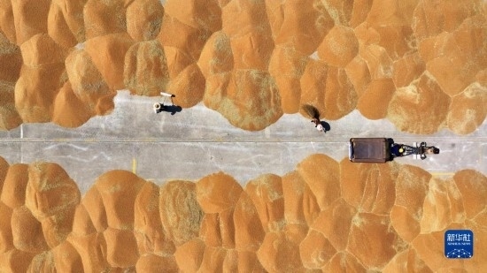 6月9日,江蘇省淮安市淮安區(qū)白馬湖農(nóng)場工人在晾曬小麥(無人機(jī)照片)。